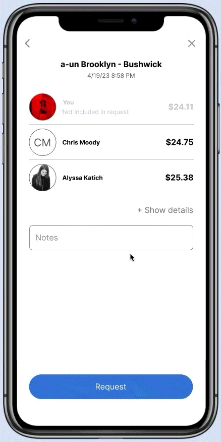 Even Splitting: Some users that planned on splitting the bill evenly at a later time still wanted to utilize the POS integration as a reminder in Venmo. To enable a quicker transaction for those groups of users, I added a toggle to split the bill evenly amongst the selected diners.