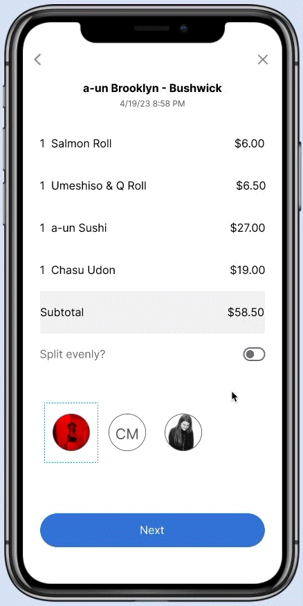 Even Splitting: Some users that planned on splitting the bill evenly at a later time still wanted to utilize the POS integration as a reminder in Venmo. To enable a quicker transaction for those groups of users, I added a toggle to split the bill evenly amongst the selected diners.